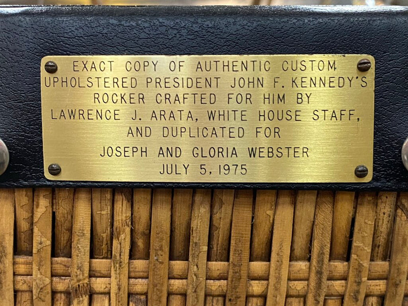 961 President John F. Kennedy Rocking Chair Rocker Upholstery Piece. If spending $50,000+ on an original John F. Kennedy rocking chair isn't your idea of a good time, here is the next best thing, a piece of the antique honey white upholstery used on President Kennedy's Rocker in 1961. The description is from a card that accompanies the upholstery fabric strip, signed by Norma Arata (his wife) for Larry Arata, White House upholster, who has signed the card adding provenance to the collectible. Original.