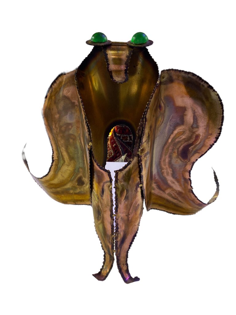 Torched Metal Brutalist Owl Sculpture With Green Glass Eyes