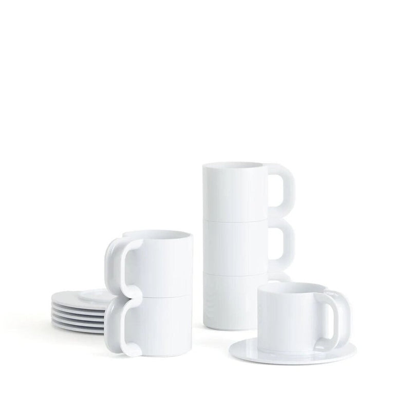 Description The Max Cups and Saucers are back and (now that espresso is here to stay) more relevant than ever. Heller's anticipated rerelease honors Lella and Massimo Vignelli's original design specification in which each handle connects to the cup wall creating a semicircular space; a thoughtful touch that elevates this espresso set above all others. The light reflecting curves, clean lines, and minimalist building block design are a visual treat that elevate your coffee drinking experience at home or in the office. As with the entire Max collection the cups and saucers are stackable, and crafted to last a lifetime for both durability and timeless design.